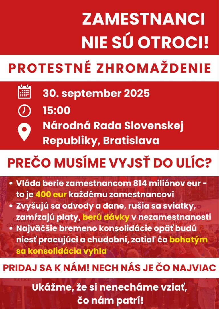 Ak ste dočítali tento email až sem a Vaša odpoveď na otázku vyššie je, že NESÚHLASÍM, pozývame Vás na protest organizovaný KOZ